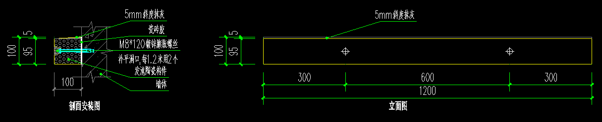(1)安裝方法:構件與墻體之間采用錨粘法固定,預先在構件背面均勻抹上瓷磚膠(或專用粘貼劑),調整位置粘貼在墻上后再打M8膨脹螺絲固定,用膠泥封堵螺絲洞口表面;兩端處錨栓位置與邊框距離不少于50mm,錨栓打孔間距600mm可作適當調整。如圖: